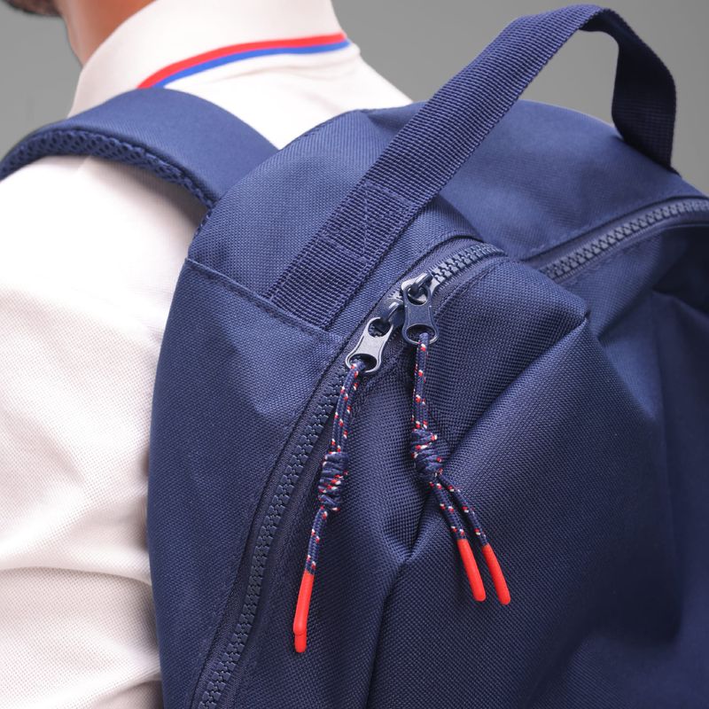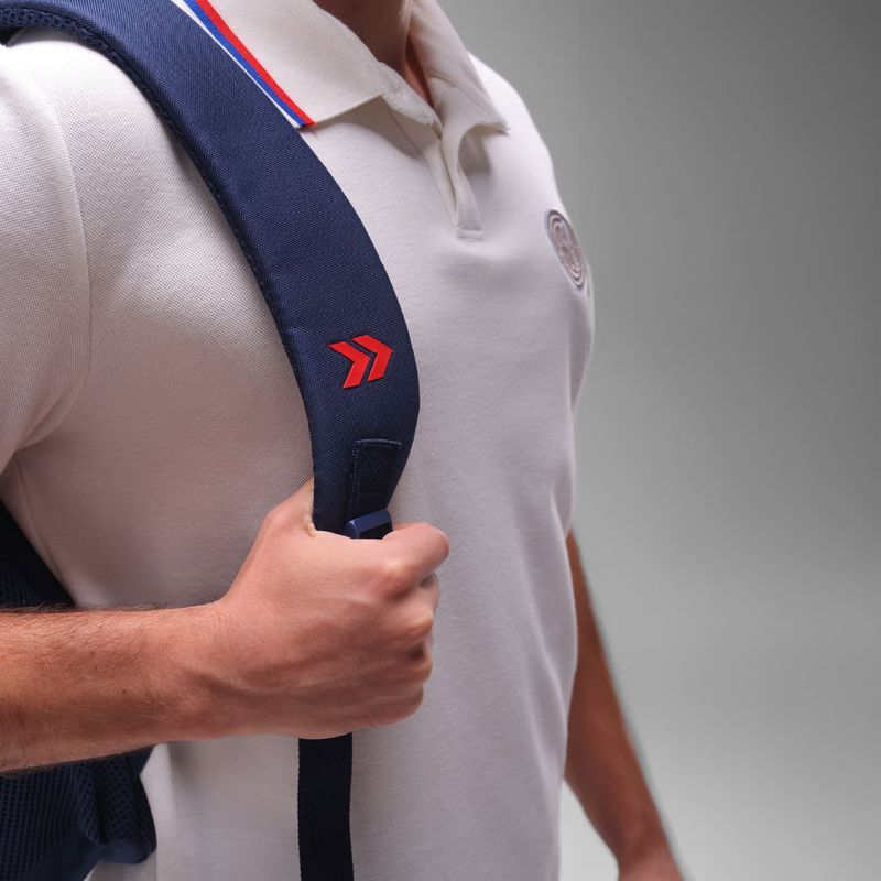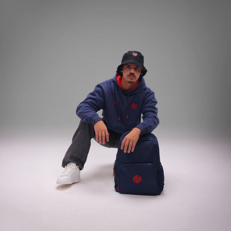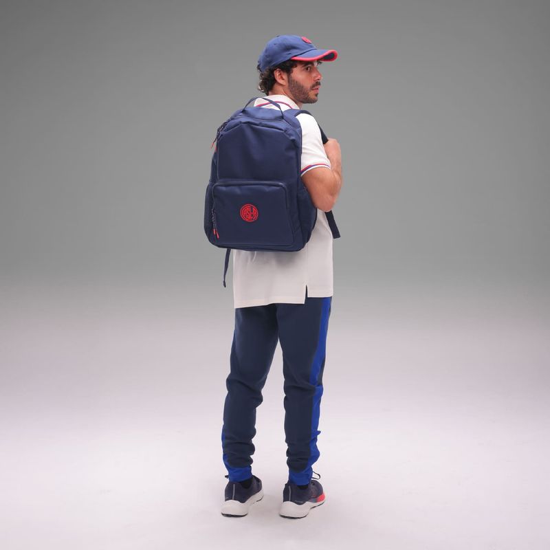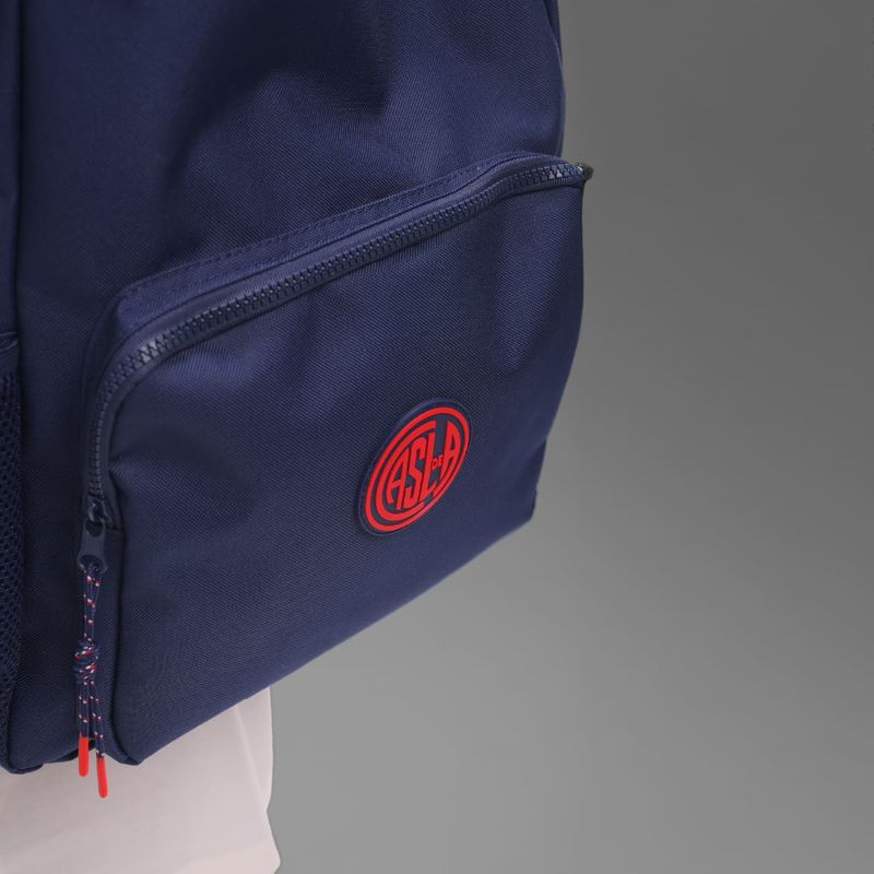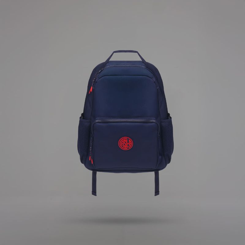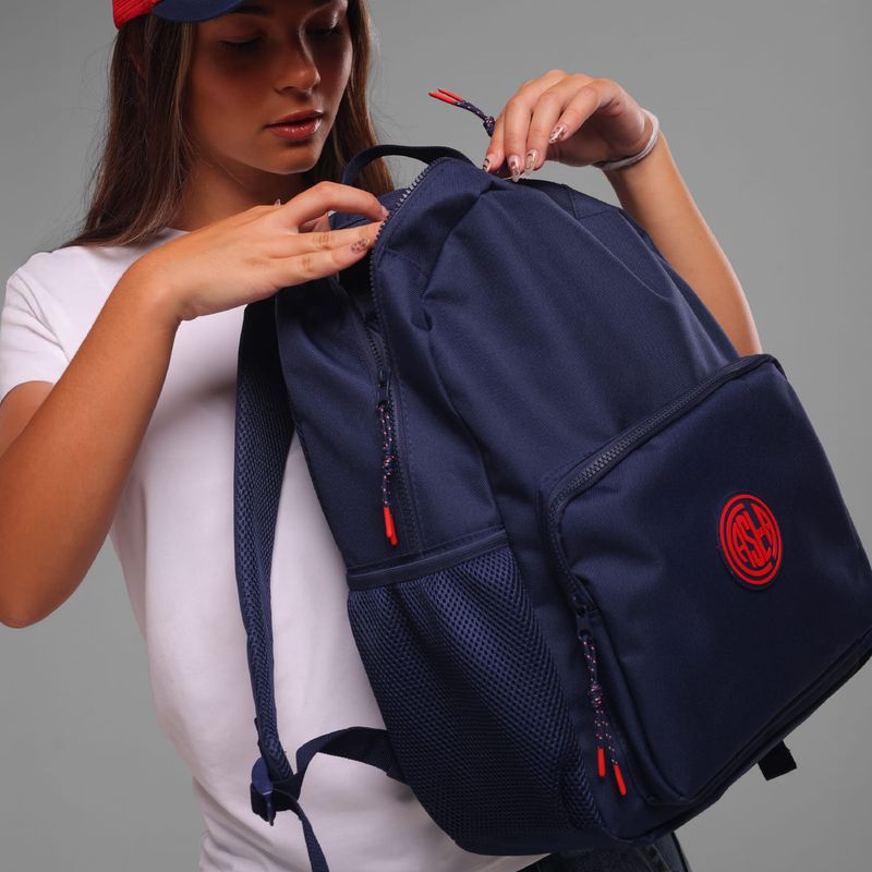 Posee acceso superior con cierre; bolsillo delantero externo; bolsillo lateral de mesh con elástico; espacio interno para laptop; logo atomik en altura; y parche de escudo casla de goma.