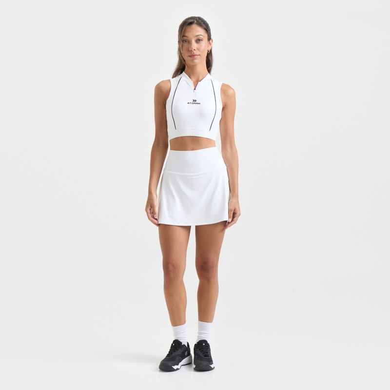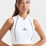 Top deportivo de escote alto con cierre frontal, confeccionado en tejido de punto deportivo de densidad media (polyester/elastano). Brinda alta sujeción del busto, ideal para actividades de alto rendimiento.